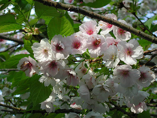 花は八重に一重も交わり、白く薄墨を含んだ花色は薄墨桜の名にふさわしい。花が終わりに近づくと中心から紅色が濃く色づく。